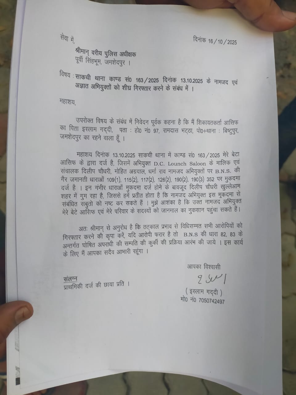 जमशेदपुर : साकची थाना कांड संख्या 163/2025 दिनांक 13 अक्टूबर 2025 के मामले में शिकायतकर्ता आसिफ के पिता इस्लाम गद्दी ने वरीय पुलिस अधीक्षक, पूर्वी सिंहभूम को पत्र दे कर नामजद और अज्ञात अभियुक्तों की शीघ्र गिरफ्तारी की मांग की है।