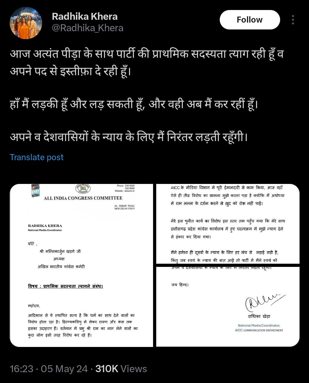 उन्होंने आगे लिखा कि मैंने जिस पार्टी को अपने 22 साल से ज़्यादा दिए, जहां NSUI से लेकर AICC के मीडिया विभाग में पूरी ईमानदारी से काम किया, आज वहाँ ऐसे ही तीव्र विरोध का सामना मुझे करना पड़ा है क्योंकि मैं अयोध्या में राम लल्ला के दर्शन करने से खुद को रोक नहीं पाई। मेरे इस पुनीत कार्य का विरोध इस स्तर तक पहुँच गया कि मेरे साथ छत्तीसगढ़ प्रदेश कांग्रेस कार्यालय में हुए घटनाक्रम में मुझे न्याय देने से इंकार कर दिया गया।