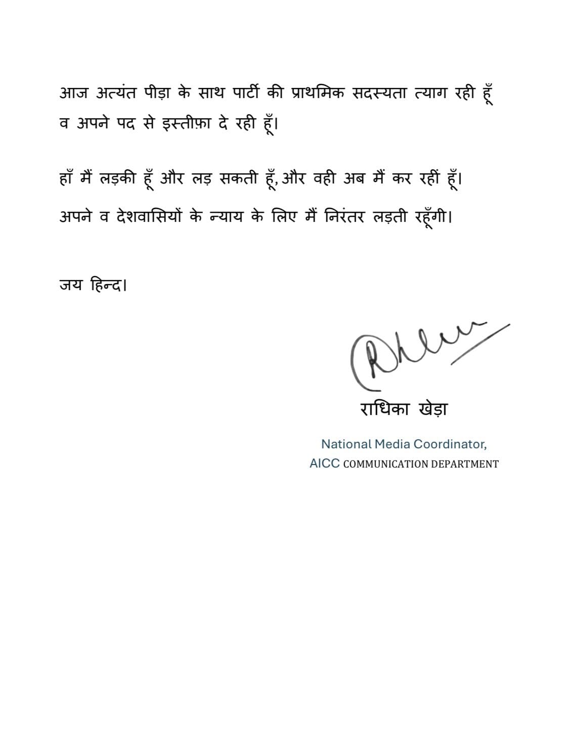 राधिका ने आगे लिखा कि मैंने हमेशा ही दूसरों के न्याय के लिए हर मंच से लड़ाई लड़ी है, किंतु जब स्वयं के न्याय की बात आई तो पार्टी में मैंने स्वयं को हारा हुआ पाया।