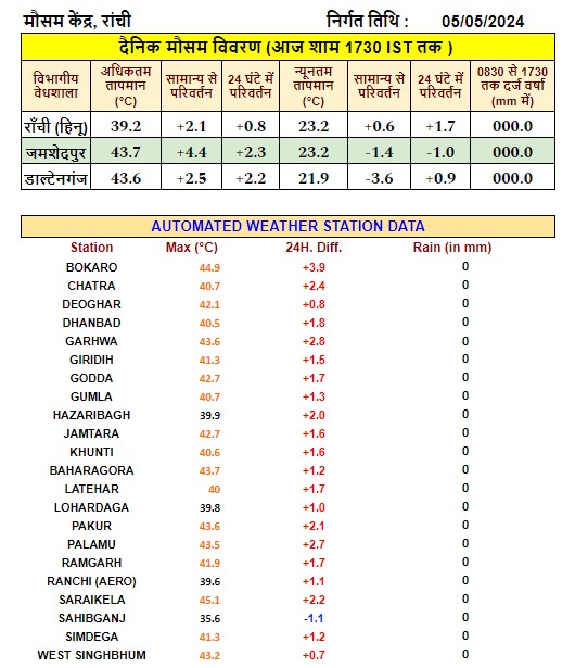 मौसम विभाग ने आज झारखंड के पांच जिलों में हीट वेव का अलर्ट जारी किया है,