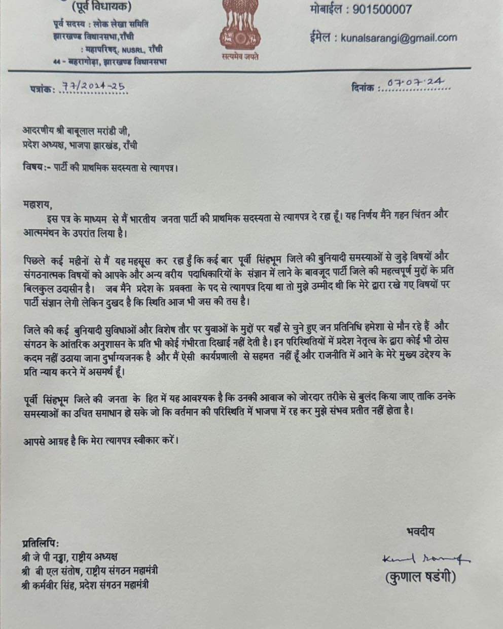 पूर्वी सिंहभूम के वरिष्ठ भाजपा नेता कुणाल षाड़ंगी ने पार्टी से दिया इस्तीफा