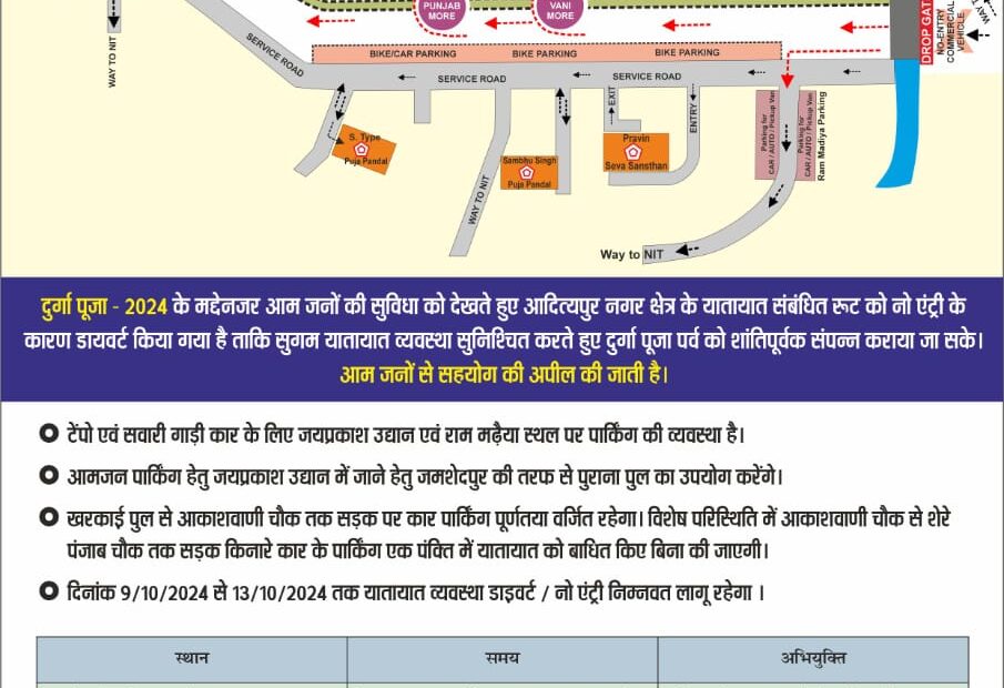 झारखंड:आदित्यपुर में दुर्गा पूजा के दौरान सरायकेला-खरसावां पुलिस ने आदित्यपुर नगर क्षेत्र में यातायात को सुचारू बनाए रखने के लिए विशेष निर्देश जारी किए हैं। 9 अक्टूबर से 13 अक्टूबर तक, भारी भीड़ और सुरक्षित यातायात व्यवस्था को ध्यान में रखते हुए, क्षेत्र के कुछ मार्गों पर नो एंट्री और यातायात डायवर्जन लागू रहेगा। इस दौरान वाहन चालकों से अपील की गई है कि वे यातायात नियमों का पालन करें और सहयोग प्रदान करें।